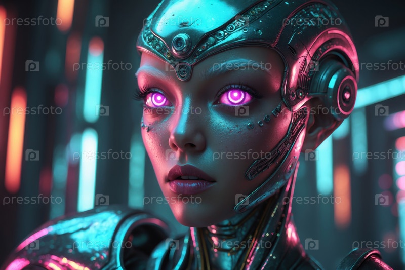 Человекоподобная женщина в футуристическом неоновом костюме, человек на будущем научно-фантастическом завтрашнем фоне AI Generative