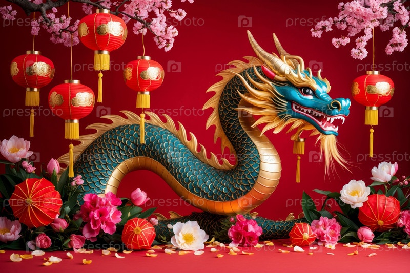 AI Generative Background Традиционные китайские символы Нового года с фонарями и вишневыми ветвями