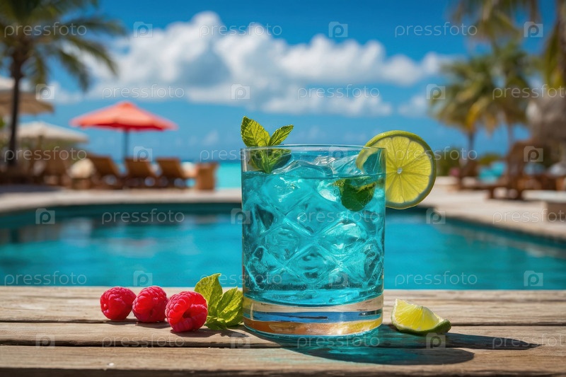 AI Generative Алкогольный коктейль на фоне бассейна, летний напиток фрукты в отпуске sea ocean
