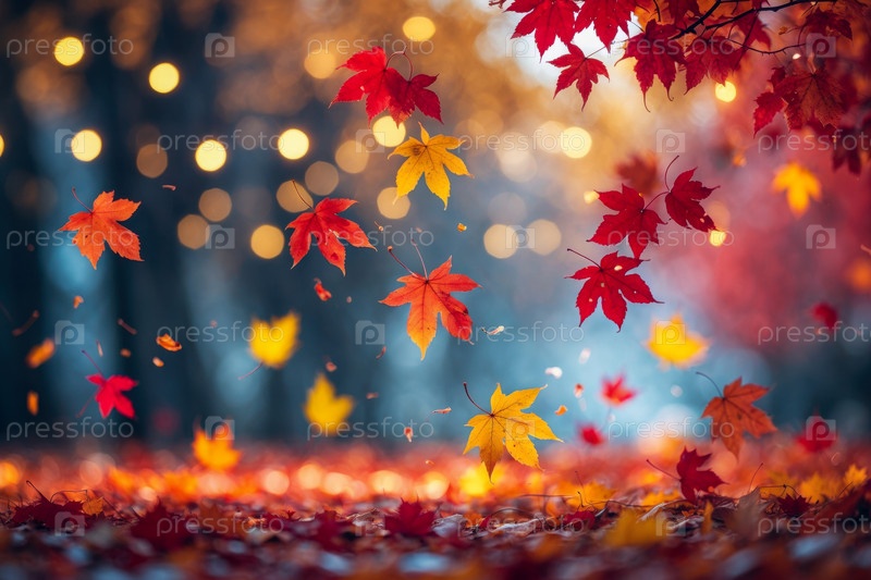 Генеративный искусственный интеллект Фон осенней атмосферы с желтыми и красными листьями, падение листьев в лесном парке