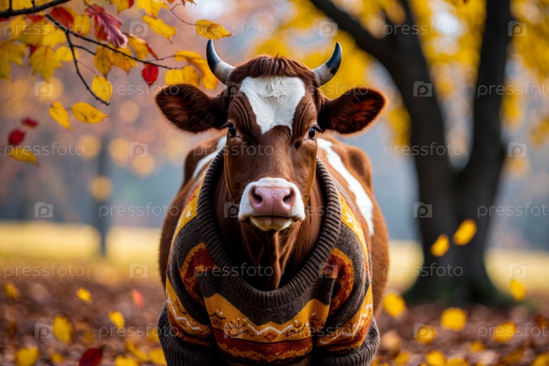 Корова в трикотажном свитере осенний лесный фон, животное в красно-желтых листьях AI Generative