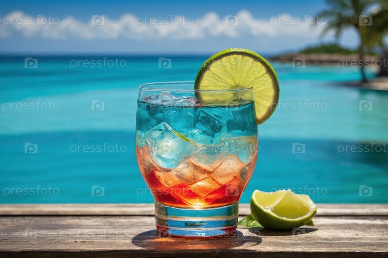 Алкогольный коктейль на заднем плане бассейна, летний фруктовый напиток в отпуске морской океан AI Generative