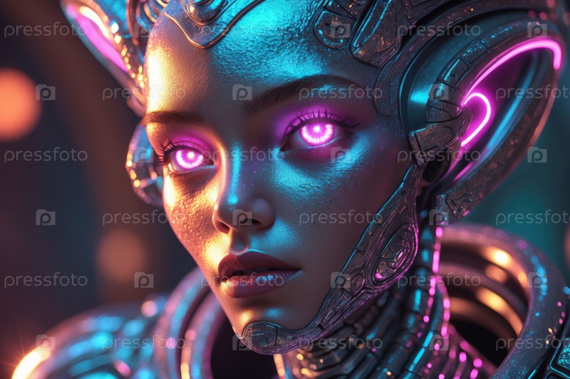Человекоподобная женщина в футуристическом неоновом костюме, человек на будущем научно-фантастическом завтрашнем фоне AI Generative