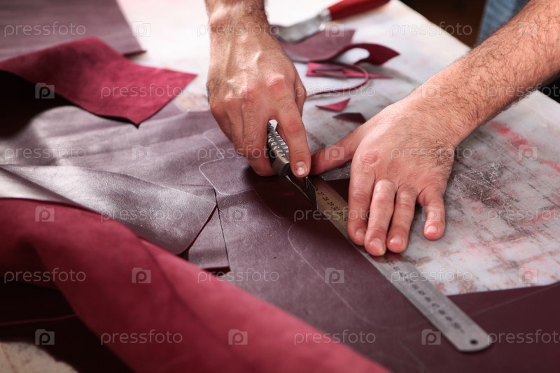 Мастер обработки кожи режет кожу в мастерской.Процесс производства аксессуаров из натуральной или искусственной кожи.Ручная работа