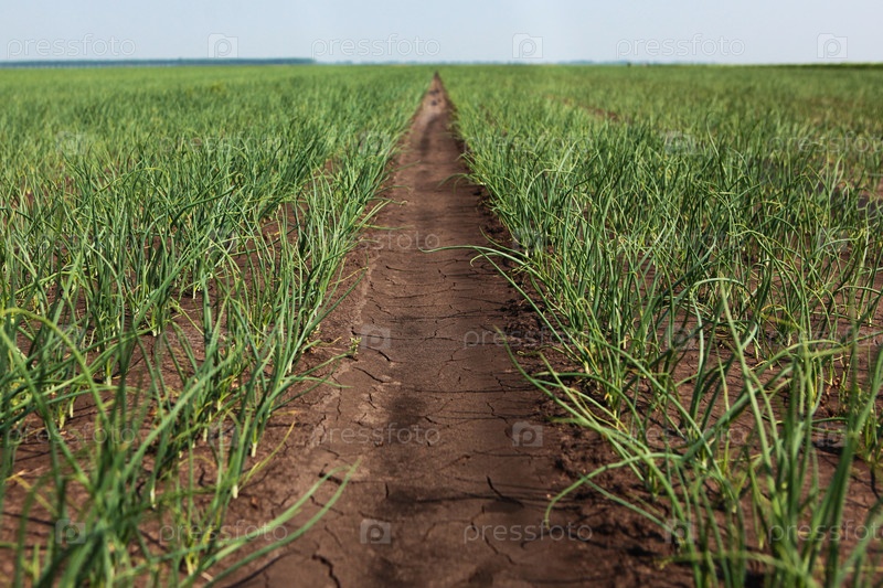 Постели с молодыми зелеными луками. Плантация зеленых луков. Работа на земле. Ферма, которая выращивает органические овощи и травы. Сельскохозяйственная промышленность. Свежий урожай зеленого лука. Уборка осенью