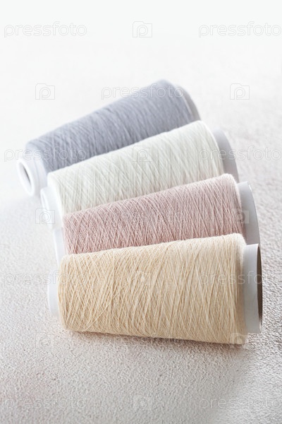 Прямая шерстяная пряжа на катушках. натуральная вата. пряжа для ручного или машинного вязания. бежевые, розовые и серые цвета. концепция хобби