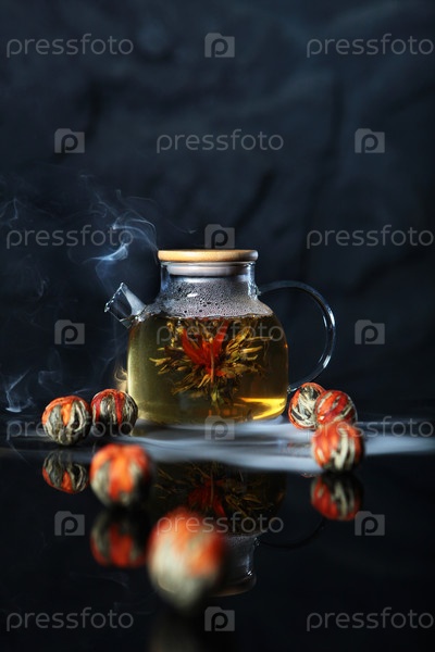 Китайский чай с жасмином.Ясминный чай в прозрачной чайнице.Открытие цветка.Здоровый напиток.Сушеный цвет.Элитный класс чая.Вертикальная фотография