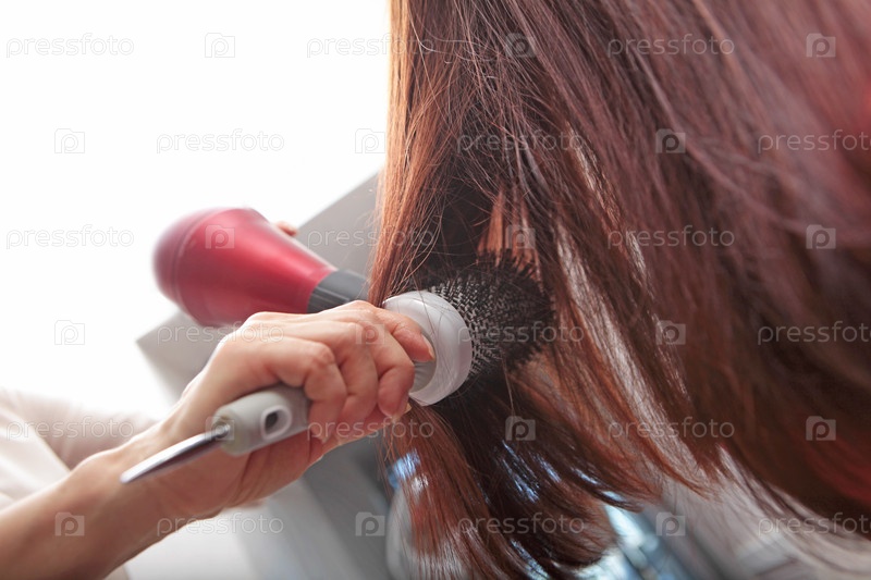 Женщина-стилистка стилизует волосы с помощью сушилки в салоне красоты. Сушка длинных коричневых волос с помощью сушилки и круглой кисточки. гребень и сушилка на близком расстоянии. Концепция салонов красоты