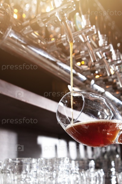 Бармен наливает темное пиво. Крафт-пиво. Блестящие стальные пивные краны в пабе. Винтажный стиль. Идея для отпуска или вечеринки. Пенообразный алкогольный напиток. Барное оборудование