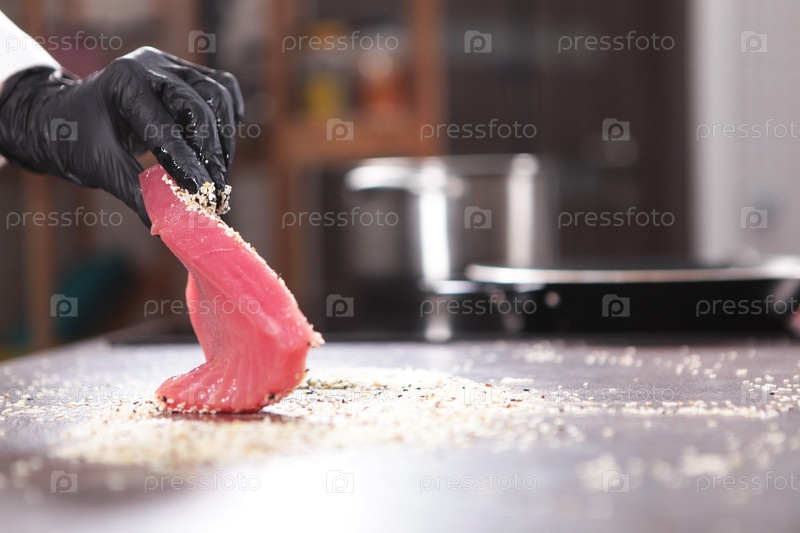 Шеф-повар готовит стейк из тунца с кунжутами. белые и черные сусамовые семена. здоровое и низкокалорийное блюдо. фотографии на кухне. крупный план