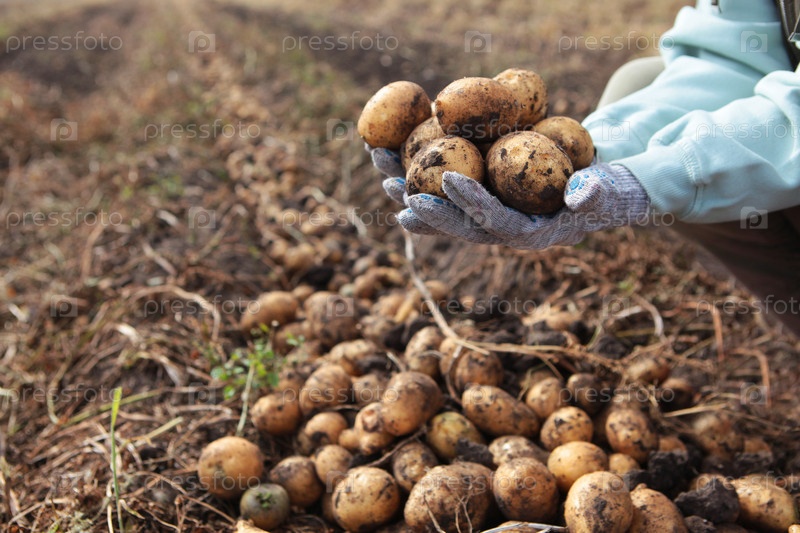 Плодородная почва. Руки в перчатках. Картофель в руках фермера. Большой урожай картофеля. Уборка картофеля. Клещи картофеля выкопаются из земли. Ферма с органическими овощами. Свежие органические продукты