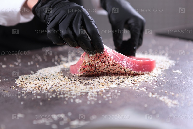 Шеф-повар в черных перчатках готовит стейк из тунца с семенами кунжута. Стейк из тунца. Белое и черное семечко сусама. Здоровое и низкокалорийное блюдо. Фотографии на кухне