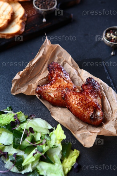 Апельсиновые куриные крылья на гриле.Апельсиновые крылышки на крафт-бумаге.Предвар для пива.Вид сверху
