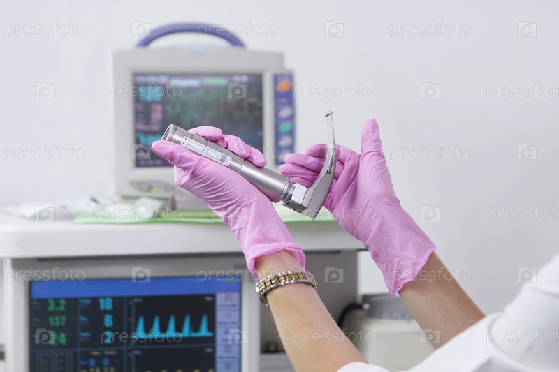 Ларингоскоп для пероральной трахеальной интубации в руках. руки анестезиолога-реаниматора. выполнение реанимации, вентиляции и общей анестезии. концепция здравоохранения