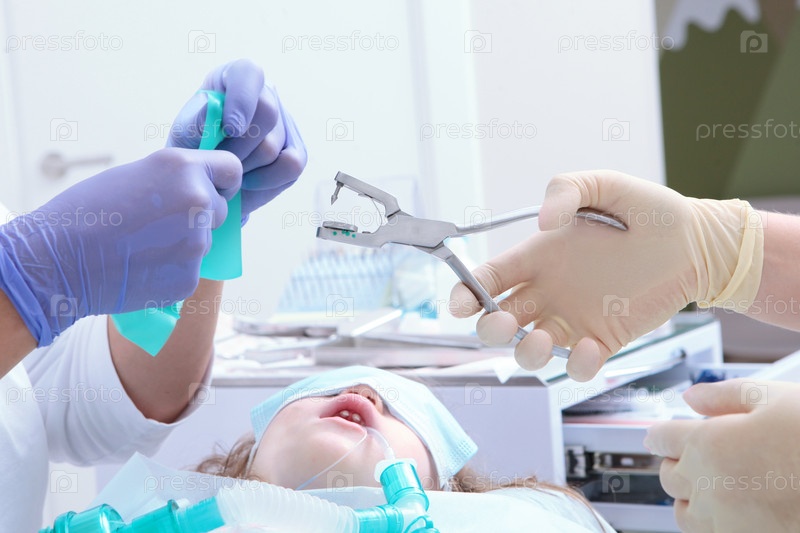 Установка коффердама для ребенка при лечении молочных зубов. Ребенок находится под анестезией. Открытый рот. Дыхательная трубка во рту. Современная стоматология. Лечение молочных зубов под наркозом