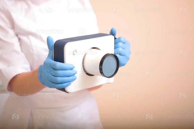 Стоматолог держит в руках рентгеновскую машину для получения изображений зубов. Рентгеновская машина в стоматологии. Только руки. Руки в защитных перчатках. Пространство для текста