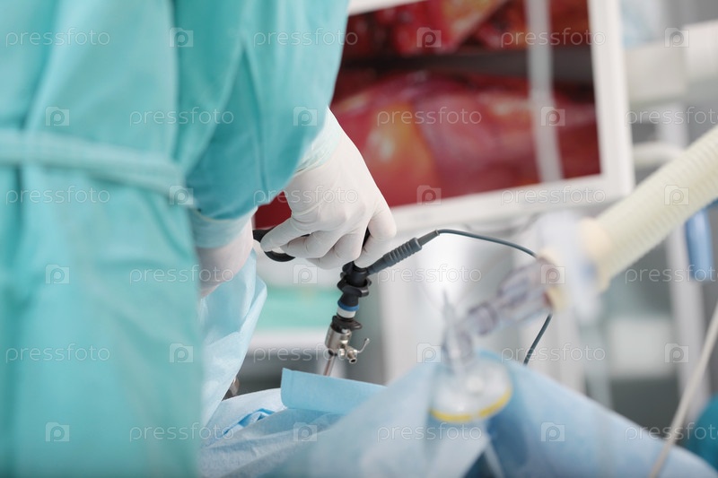 Лапароскопическая хирургия.Лапароскопические инструменты в руках хирурга.Операции на внутренних органах.Минимально инвазивная операция.Современный хирургический метод