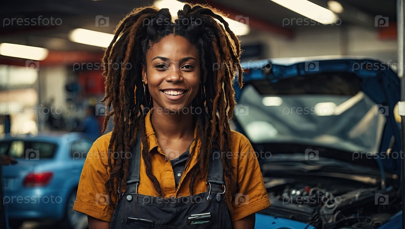 Портрет чернокожей женщины-автомеханика с дредушками в желтой рубашке, улыбающейся на автосервисной мастерской, профессиональный персонал, квалифицированная рабочая сила, пространство для дизайна