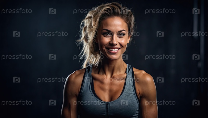 Smiling caucasian female fitness trainer in gym, спортивная одежда, личный тренер, профессиональный персонал, фитнес-клуб, мотивация, здоровый образ жизни, место рекламного сообщения