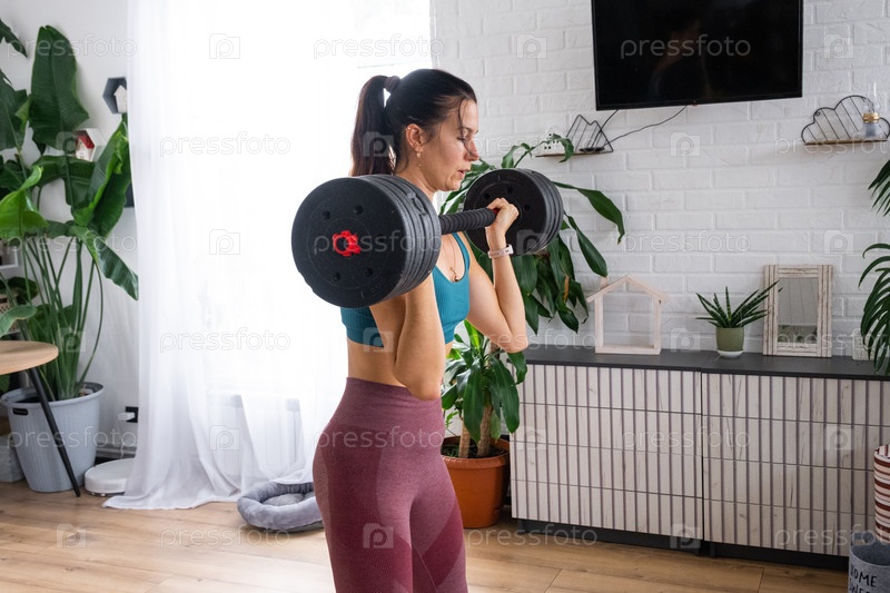 Женщина держит гантели дома, спортивный бюстгальтер и леггинсы, яркая комната, зелень, домашнее фитнес-оборудование, ежедневная рутина фитнеса, здоровый образ жизни