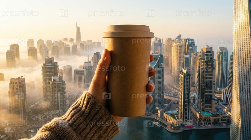 Ручная выпивка с чашечкой кофе, золотой рассвет, панорамный городской пейзаж, утренняя поездка на работу, современный горизонт многоэтажного дома, свежие напитки, городской образ жизни