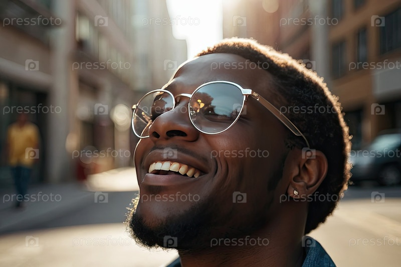 Стильный афроамериканский мужчина в круглых очках, улыбающийся на городском закате солнца, молодой креативник, современное здоровье глаз, цифровая усталость от времени перед экраном, пространство для баннеров для текста