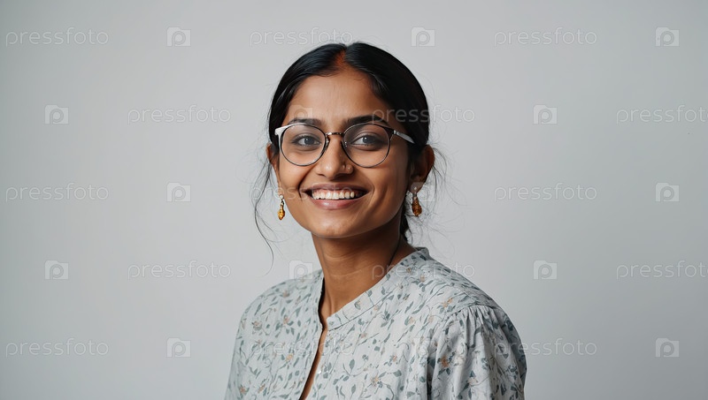 Юная азиатская девушка в минималистических очках, изящный конский хвост, бежевое платье, чистый фон. проблемы со зрением, новый стиль рамы, тема образования, онлайн-промо, иллюстрация электронного обучения, область для текста