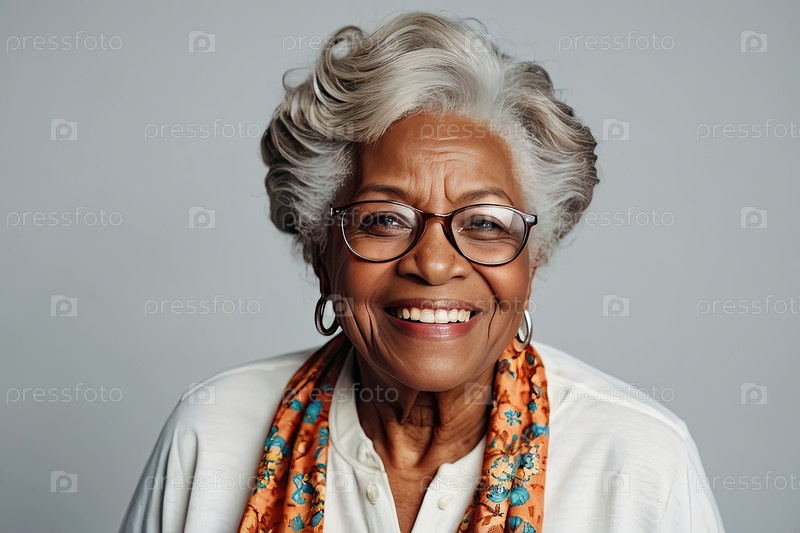 Улыбающаяся пожилая чернокожая женщина с белыми кудрявыми волосами, фоном из студии, продвижение здравоохранения, терапия зрения, поддержка старения, позитивный образ жизни, зона для текста
