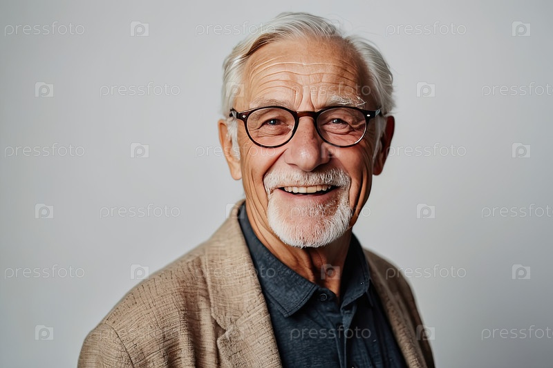 Пожилой белый мужчина с круглыми очками, короткие седые волосы, коричневая куртка, веселая, студия. нуждается в коррекции по возрасту, классический стиль, листовки здравоохранения, геронтология, текстовое пятно