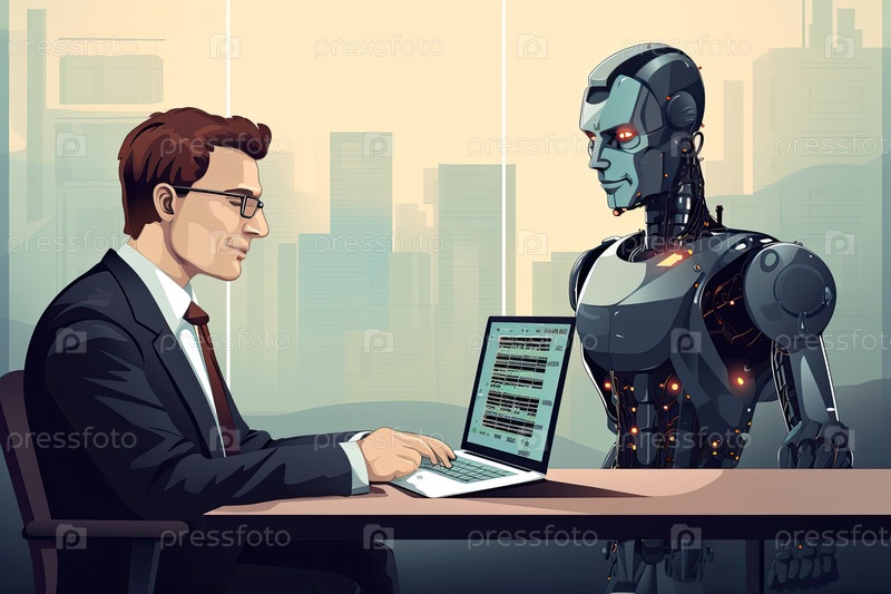 Бизнесмен взаимодействует с гуманоидным роботом за рабочим столом, обмениваясь идеями и сотрудничая над новыми проектами искусственного интеллекта и автоматизации