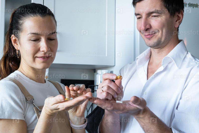 Семья принимает пищевые добавки дома, витамины для мужчин и женщин, иммунную поддержку, витаминный комплекс группы В, омега-3, рекламное использование