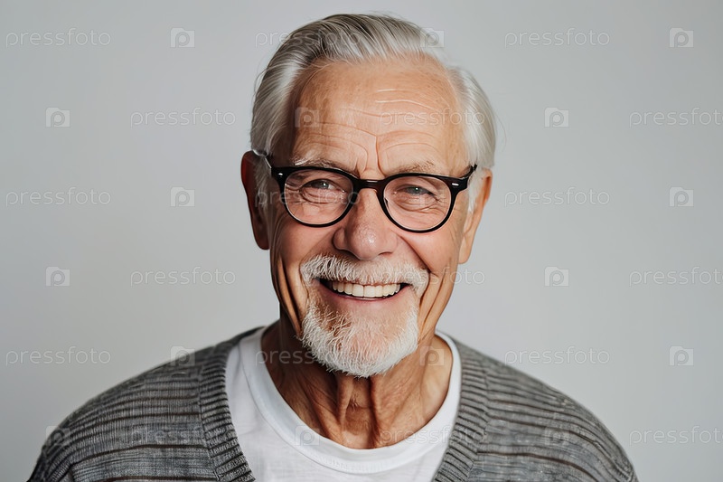 Улыбающийся старший кавказский мужчина в светлом кардигане, квадратные очки, седые волосы, студия, дружественная поза