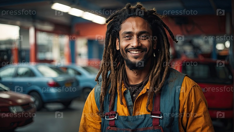Портрет улыбающегося чернокожего механика с дределями в желтой рабочей одежде на автомастерской, технический персонал, квалифицированный сотрудник, уверенный, пространство для текста