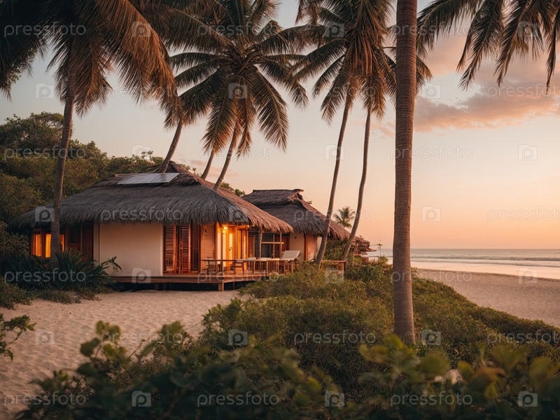 Эко-курортный бунгало под заходящими пальмами, солнечные батареи на крыше, безопасность зеленых отелей, устойчивое энергетическое путешествие, цифровые художественные работы
