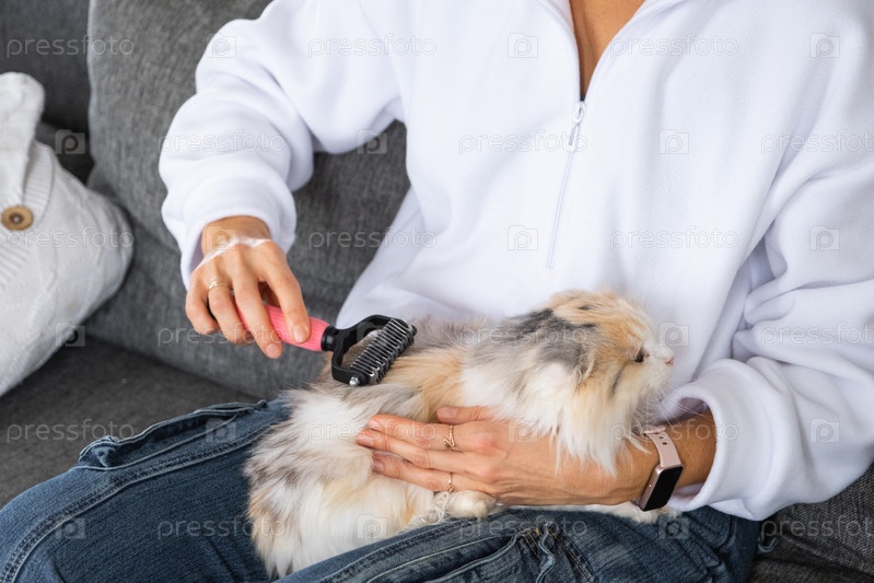 Прикосновения и расчесывание шотландской складки, развязка шерсти, удаление ковриков, женщина на диване, занимающаяся домашним хозяйством, принадлежности для ухода за кошкой, советы по гигиене питомцев