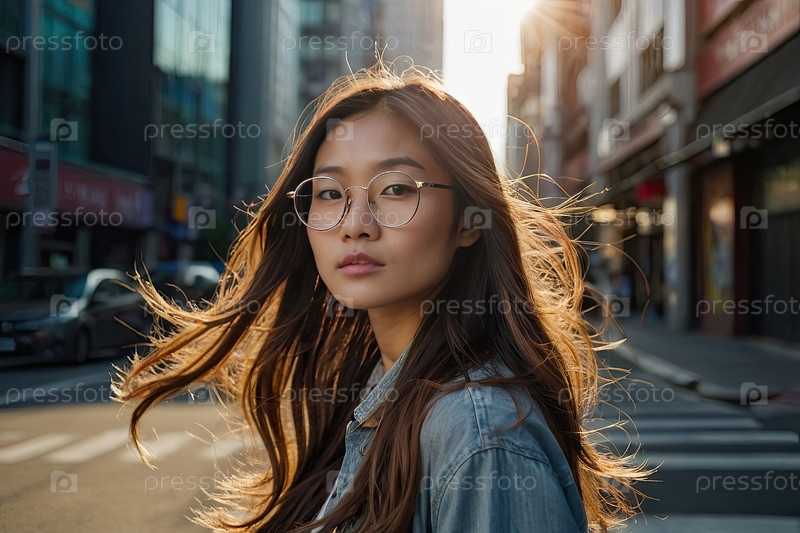 Азиатская девушка в больших круглых очках, ветреные волосы, улица города "Золотой час".Проблемы со зрением, оптическая мода, модный стиль рамы, городская молодежная культура, кампания по осведомлению о видении