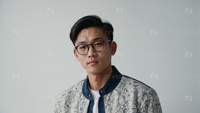Молодой азиат в очках, серый студийный фон, студент сталкивающийся с цифровым напряжением глаз, академический образ жизни, современное образование, пространство для текста баннера