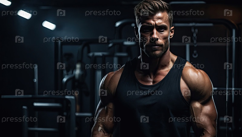Сильный кавказский мужской фитнес-тренировщик с мышечным строением в тренажерном зале, профессиональный портрет тренера, фитнес-клуб, бодибилдинг, область для сообщения