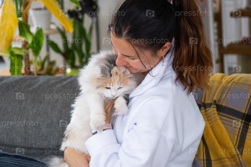 Женщина обнимает шотландского кота Fold, темы ухода за домашними животными и комфорт дома, эмоциональная связь, мягкий и любящий момент, питомец в уютном доме