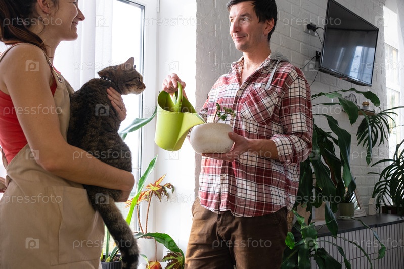 Молодая пара смеется и поливает комнатные растения вместе, веселое домашнее садоводство, уютная солнечная квартира, совместное экологическое хобби, лиственный декор
