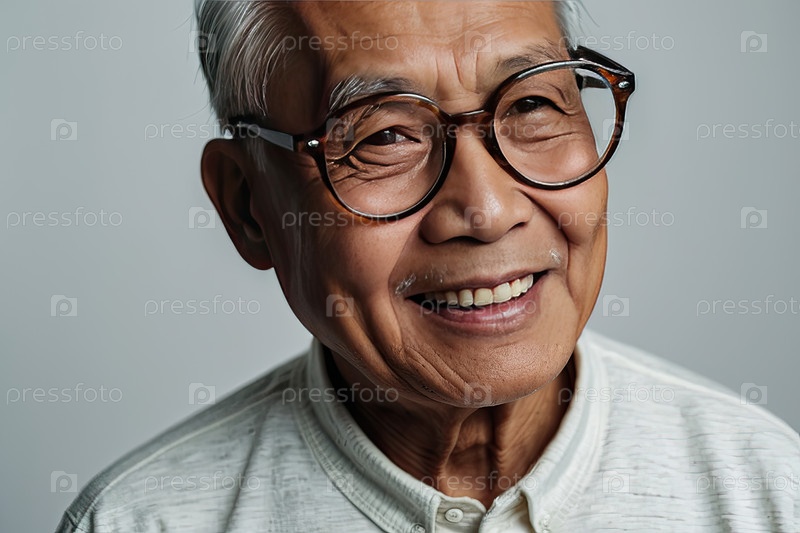 Портрет улыбающегося пожилого азиатского мужчины в очках, светло-серый фон, осознание нарушений зрения, здоровый образ жизни, медицинское продвижение, пространство для текста