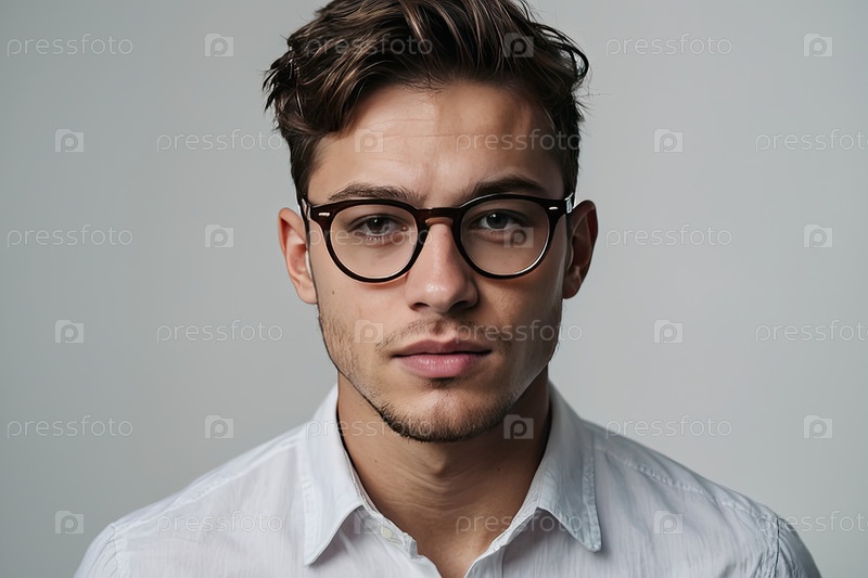 Бизнес-студент в очках и белой рубашке, светлый фон, фокус зрения, цифровое рабочее пространство, современное консультирование, рост карьеры, здоровье, творчество, копиракет