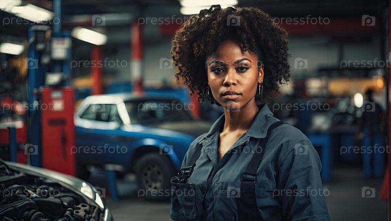 Портрет серьезной молодой афроамериканки-механика в синей форме на автомастерской, уверенная женщина-техник, профессионал, техническая поддержка, копировальное пространство