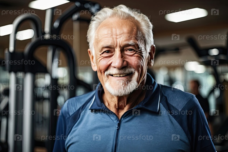 Белый пожилой мужчина, около 75 лет, в спортивной рубашке, тренажерный зал, портрет, здоровое здоровье, фитнес, счастливое активное старение, редакция, реклама, здравоохранение, баннер