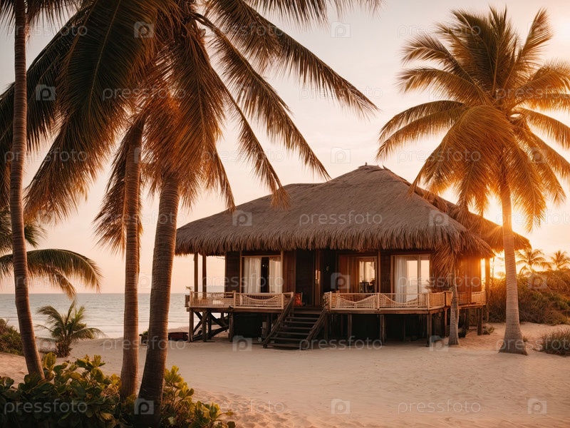 Береговая бунгало в тени пальмовых деревьев, эксклюзивный отдых, частная туристическая вилла, сайт турагентства, рекламные материалы премиум-класса