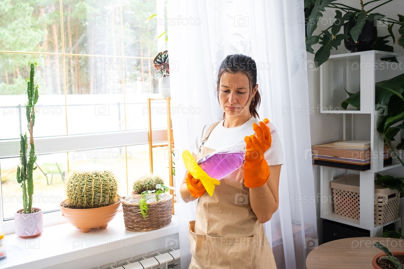 Женщина недовольна работой по уборке окон, усталое выражение лица, перчатки и фартук, домашняя рутина, весенний выгорание, потребность в поддержке компании-чистильщика, внутреннее объявление
