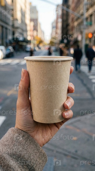 Ручная чашка с кофе, осенний рукав, оживленная городская улица, непринужденная утренняя прогулка, уютный образ жизни, городской утренний напиток, туристическая атмосфера