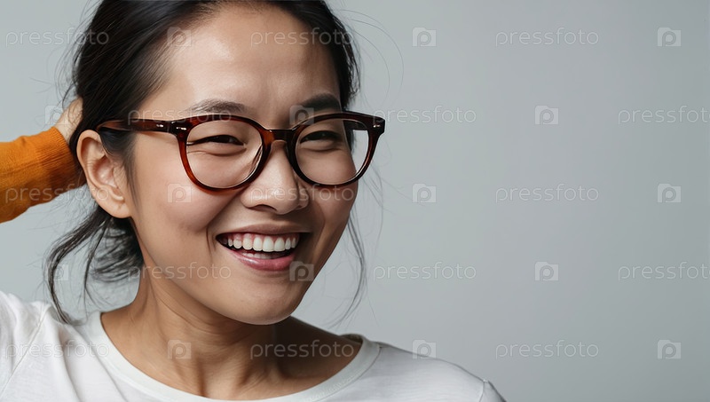 Молодая азиатская женщина в очках, капюшоне, студия, радостная улыбка, снижение зрения, выбор очков, оптимизм, простой серый фон, копирайтинг