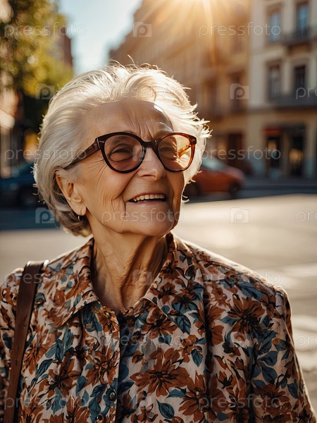 Элегантная пожилая женщина с короткими белыми волосами и очками, улыбающаяся на солнце, городская улица, профилактика проблем со зрением, активный образ жизни, тема здоровья пенсионеров, текстовое пространство