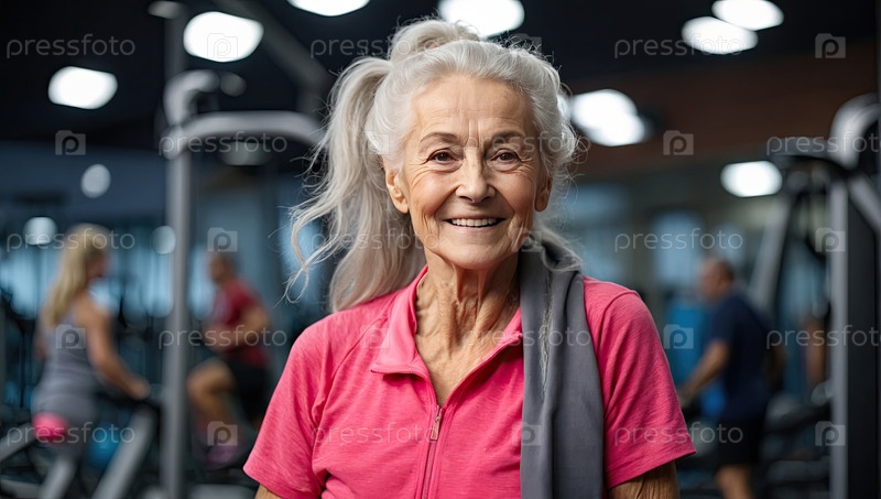 Пожилая белокожая женщина, 75 лет, в розовом фитнес-одеве, улыбающаяся, тренажерный зал, здоровый образ жизни, оздоровление, тренировка, старший фитнес, редакция, реклама, пространство для текста